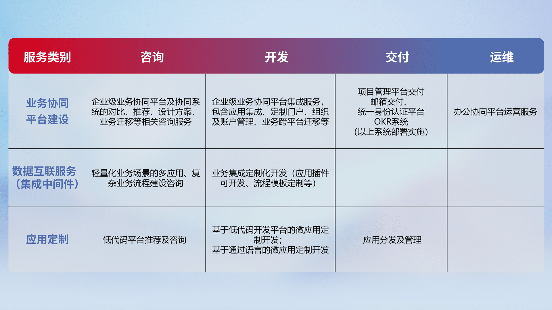 针对钉钉、、企微、、、IDaas等平台级产品提供产品的规划、、、、方案、、交付、、定制化开发等服务,,,,实现如统一协同办公、、智能客户服务、、、混合会议管理、、、智能数据查询、、、等业务场景,,实现数字化转型。。。。
